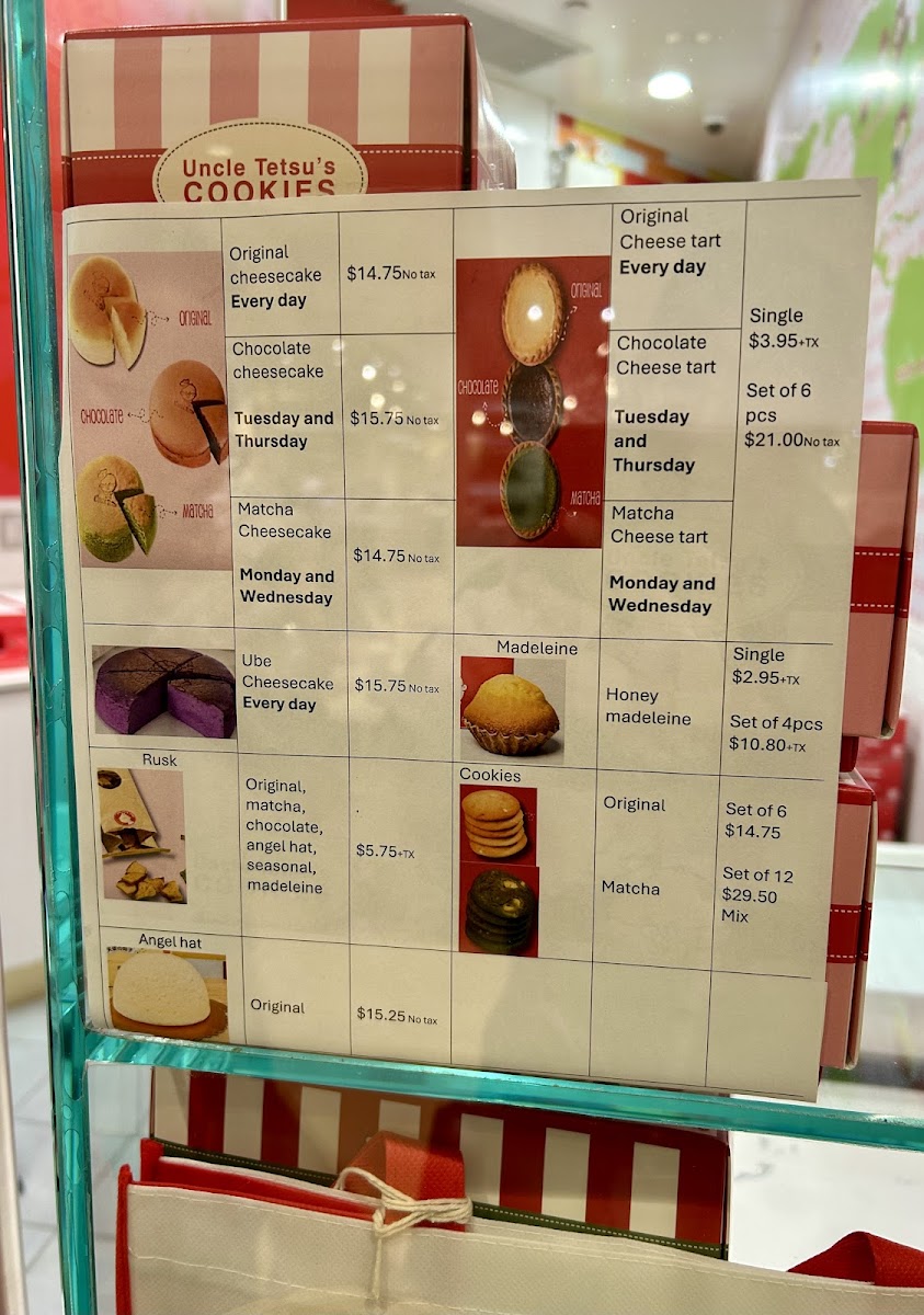Uncle Tetsu's Japanese Cheesecake, Hillcrest Mall Menu